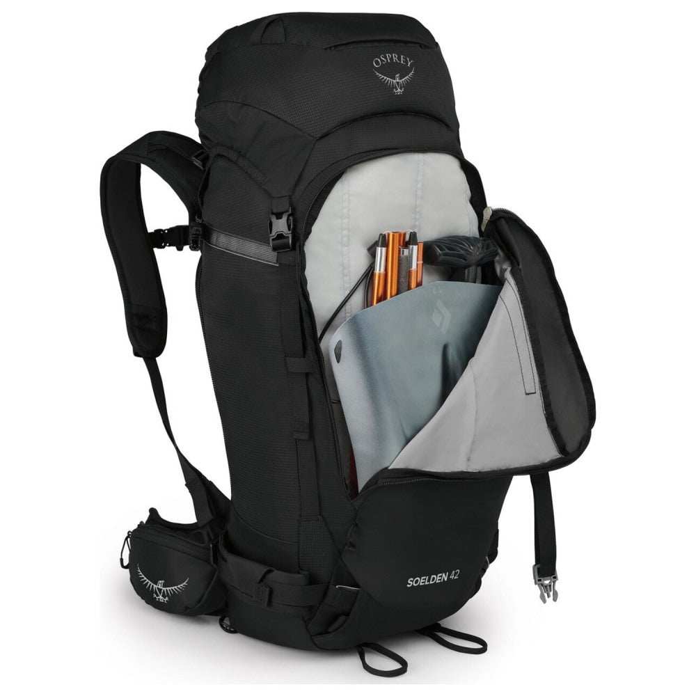 - Large front panel J-zip access to avalanche safety kit pocket with shovel handle and probe sleeves